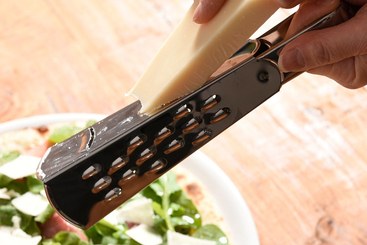 チーズをおろしてサラダやピッツァを仕上げたり、ホールスパイスや柑橘の皮を削ったり、ちょっとだけ食材をスライスしたい時など気軽につかえる四面グレーターです。レストランでのプレゼンテーションにもおすすめです。