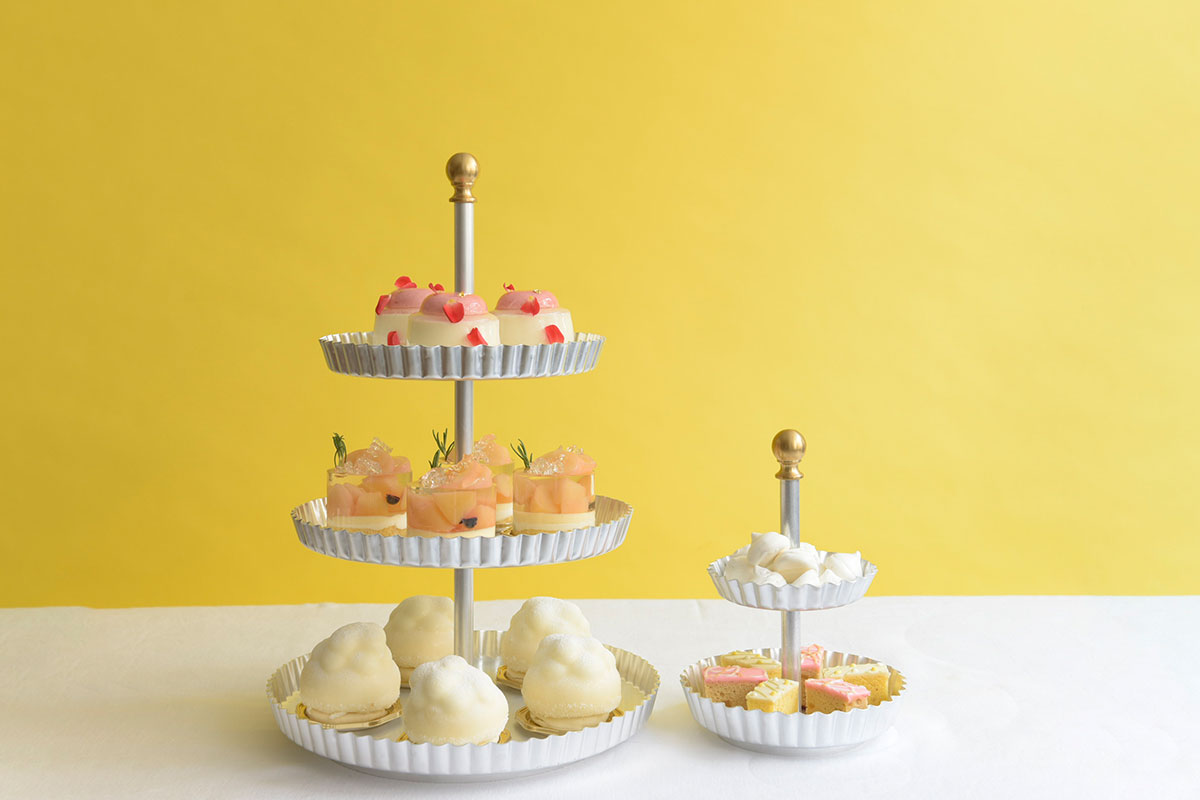 タルト型・プレーンの2タイプからお選びいただけるビュッフェスタンドは、ケーキなどのスイーツやパン・フルーツなどを華やかに引き立て、アルミの素材感が柔らかな印象を演出します。