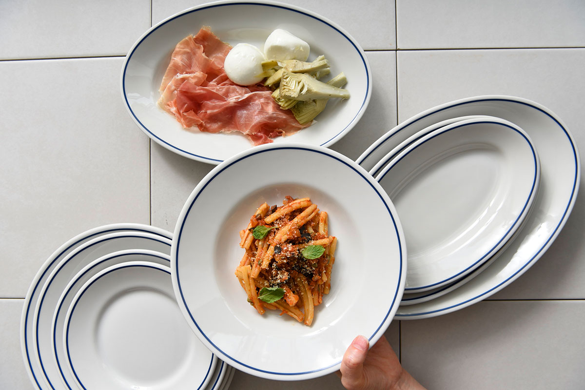 盛り付けやすい形と定評のイタリア料理の食卓には欠かせないチボリシリーズにブルーラインを施しました。