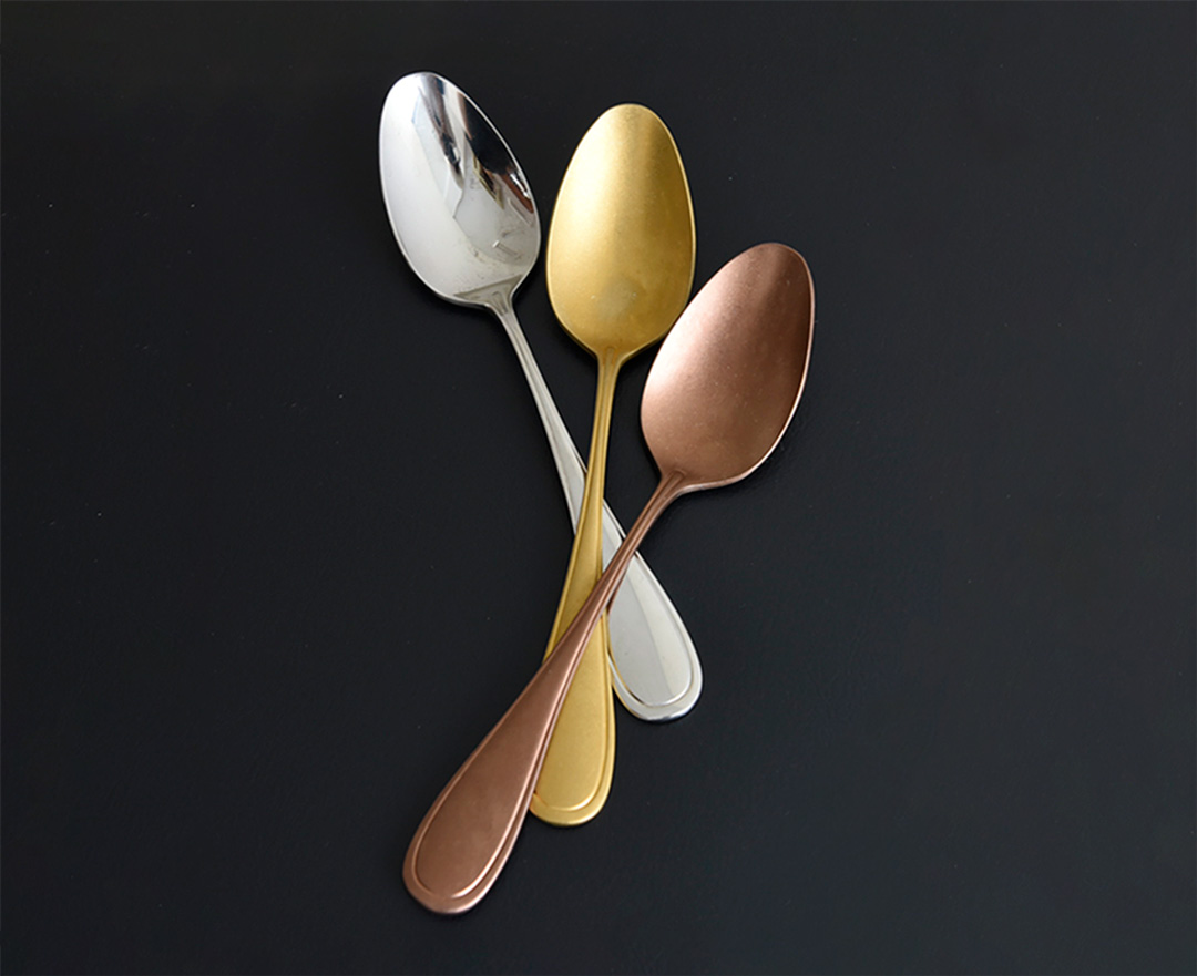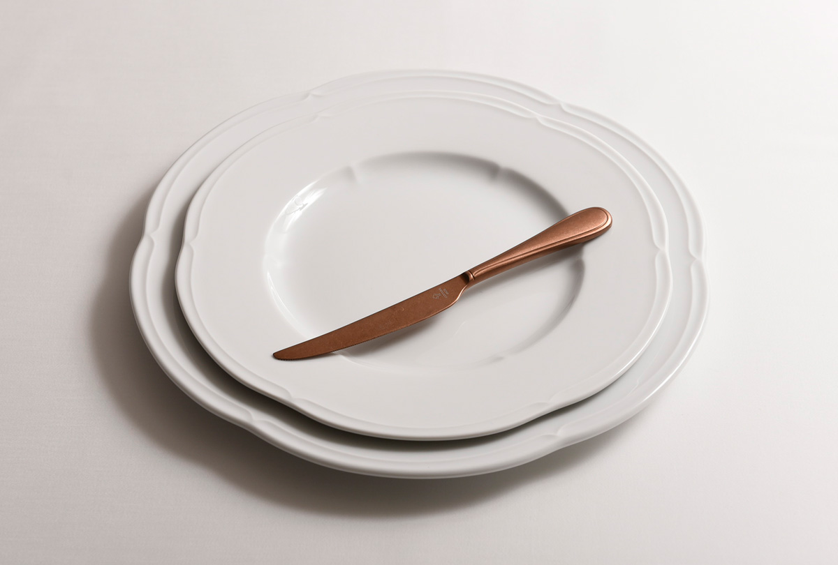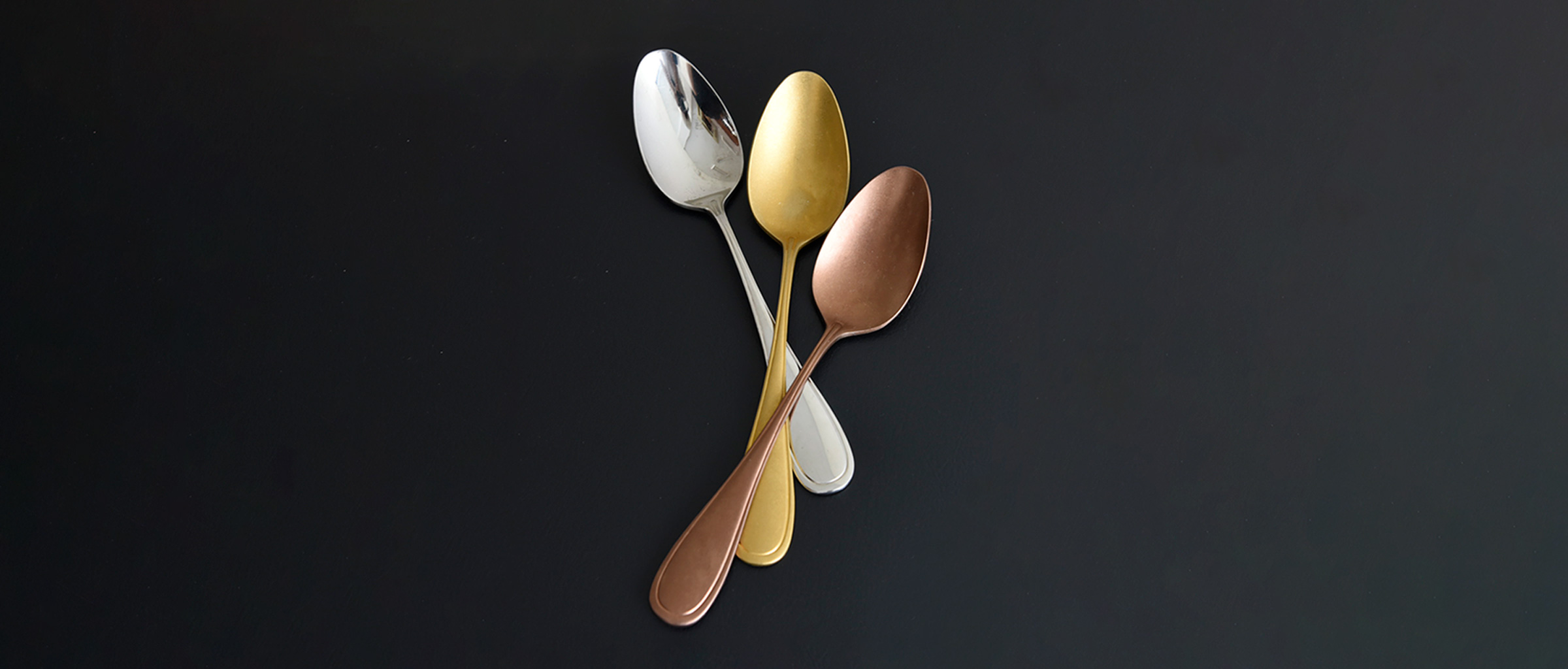 丸みを帯びたグラマラスなデザインが魅力。クラシックからスタンダードなお食事まで対応いただけます。 ヴィンテージ加工により華やかでありながら落ち着いたトーンに仕上がったゴールドとコッパー(銅色)にスタンダードなミラー仕上げ3種のバリエーションです。