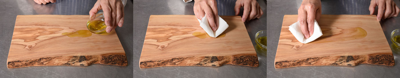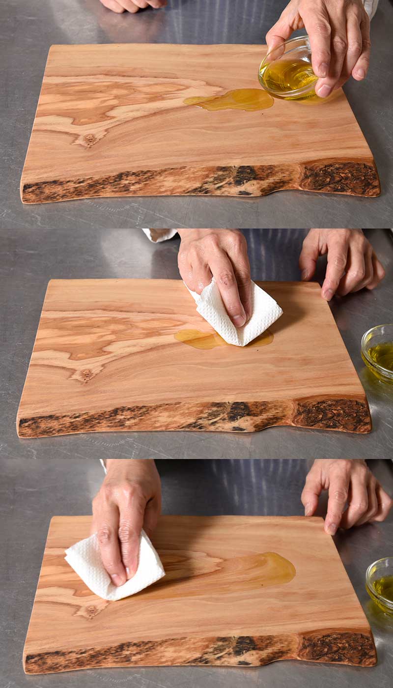 固くしぼったフキンで水拭きするか、よく洗って乾かした後、植物油(胡桃油・荏胡麻油等)をボードに垂らし、ペーパータオルで全体になじませ、余分な油を拭き取ります。