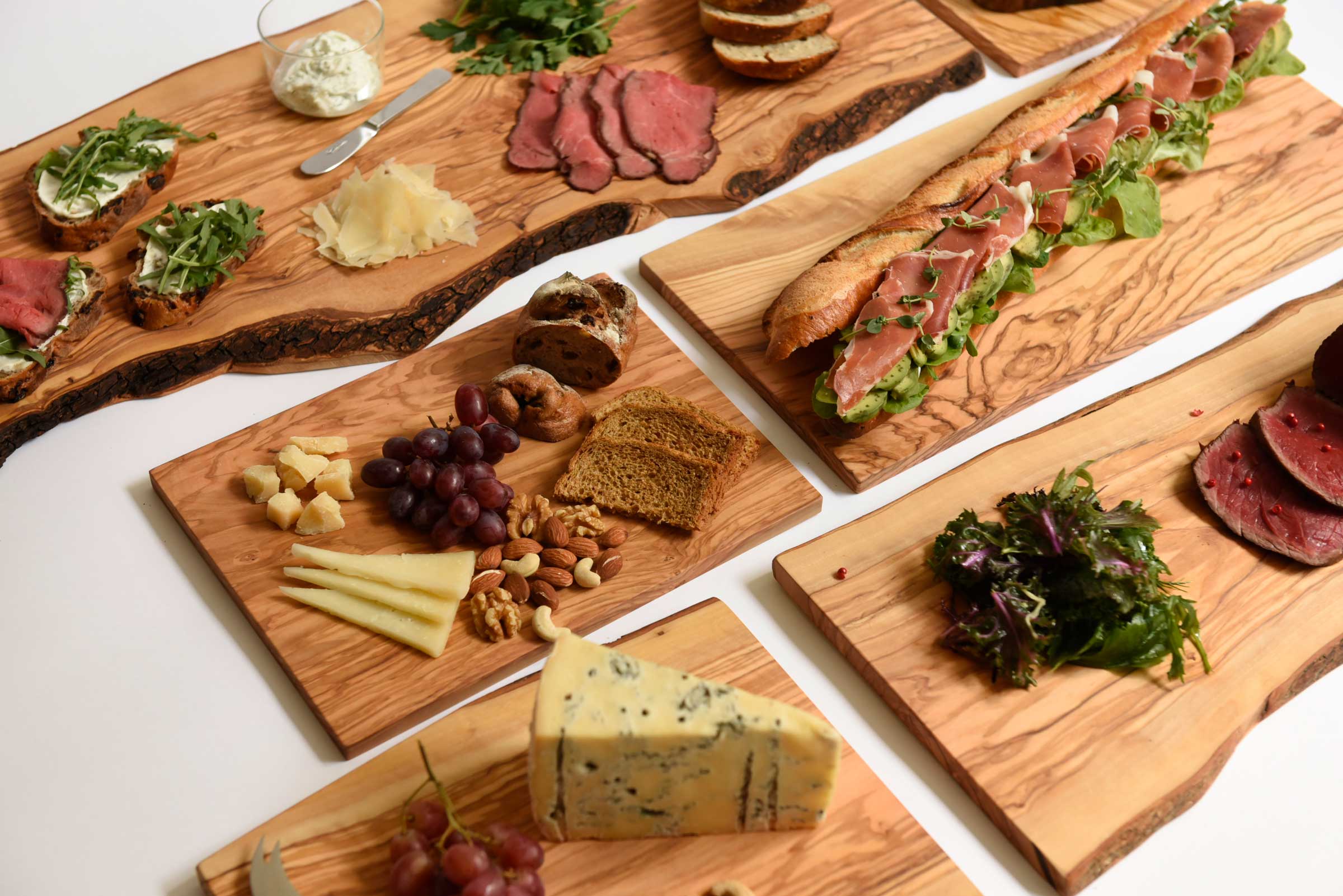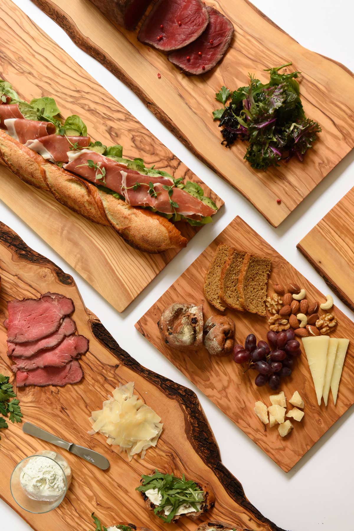 自然なオリーブの木目を生かしつつ、モダンでシャープな形に仕上げました。軽量で持ち運びしやすく、チーズや生ハムなど数種類のオードブルをゆったり盛りあわせできるサイズ。