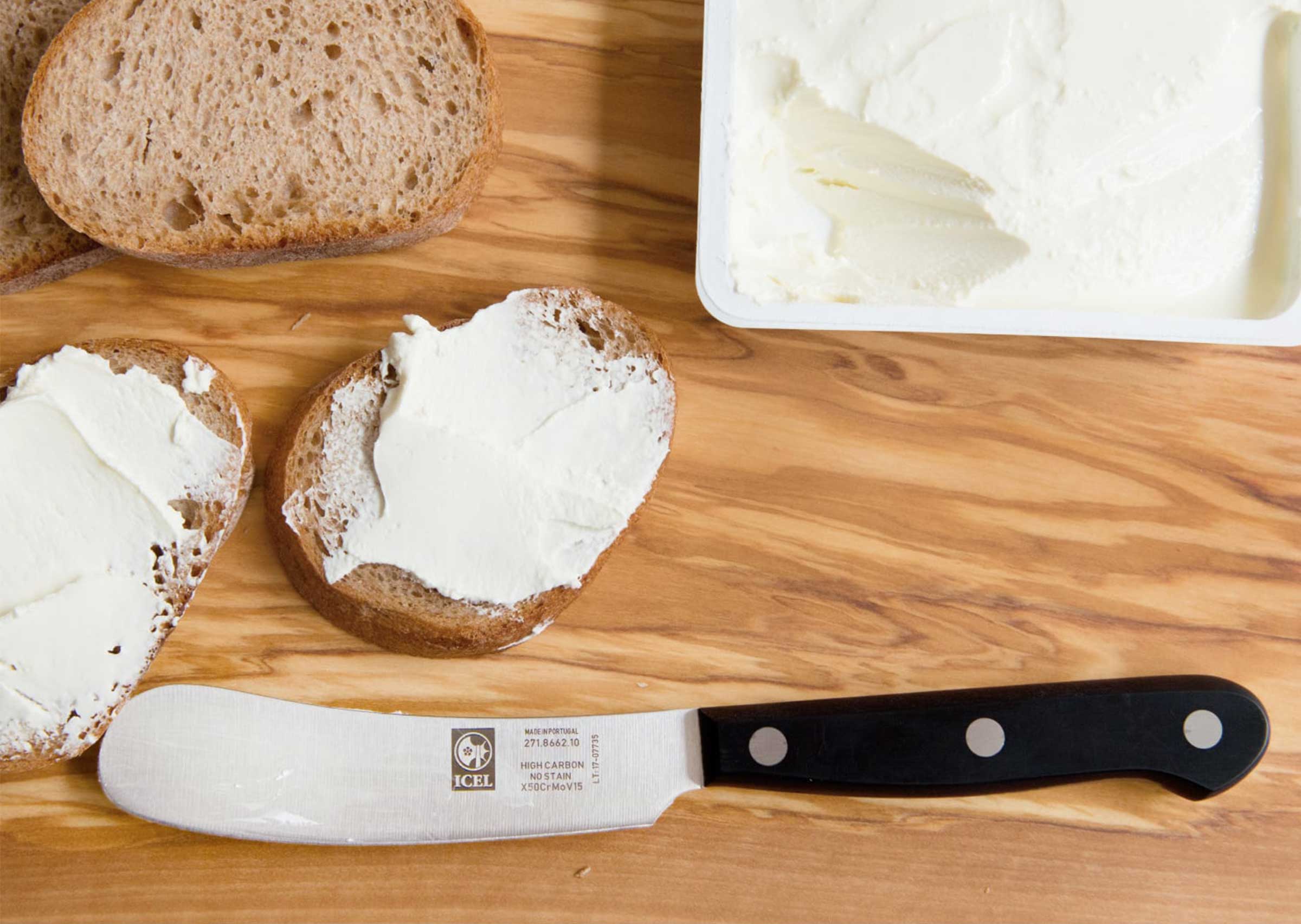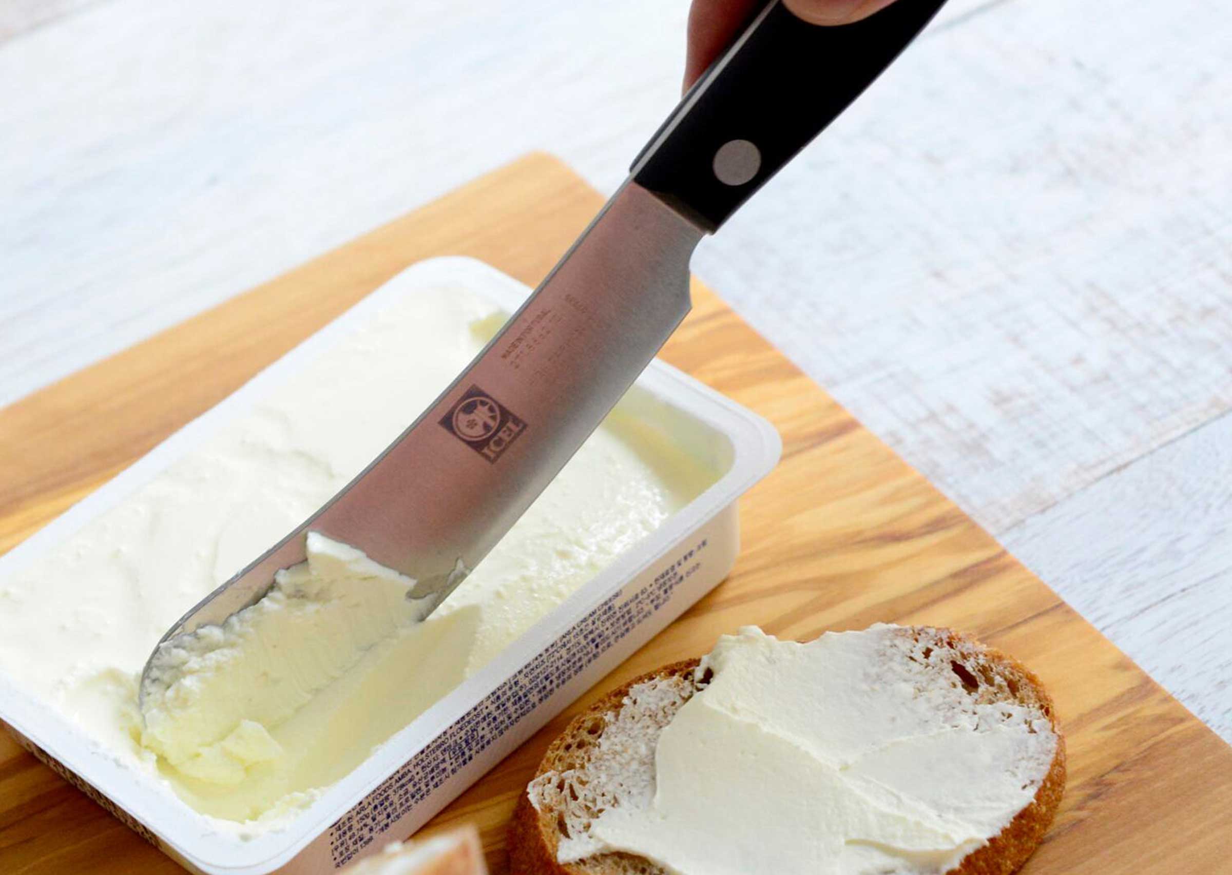 スプレッド型のナイフは安定感のあるグリップで、クリームチーズやウォッシュタイプなどのトロッと柔らかいチーズをスムーズにのばします。