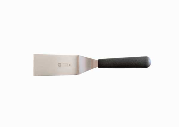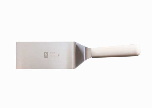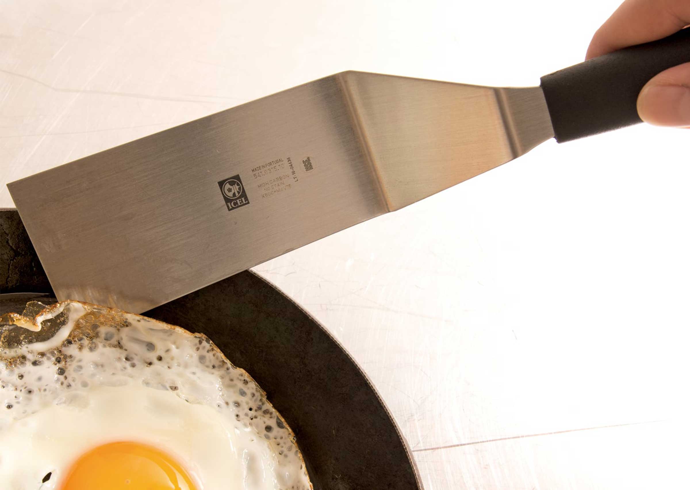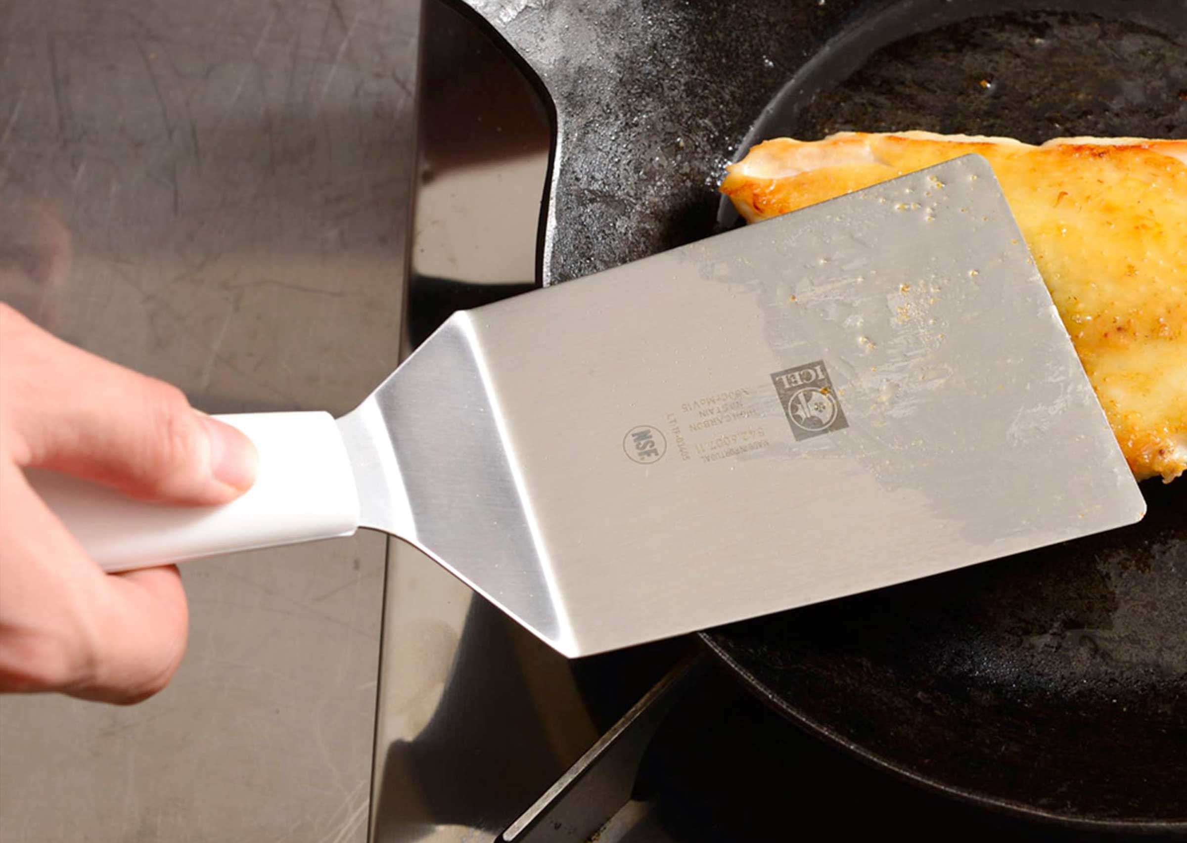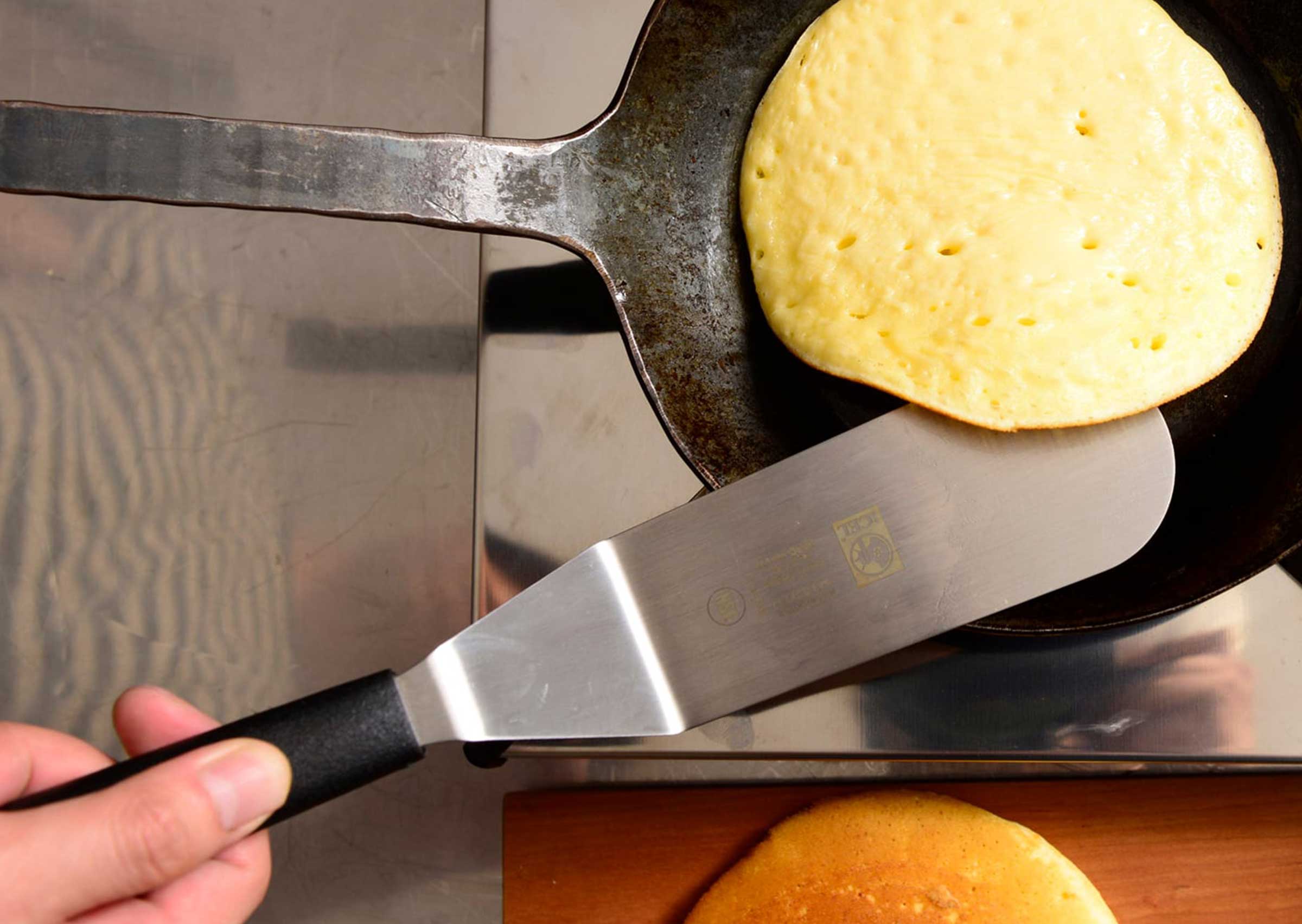 樹脂製のハンドルは握りやすく、ステンレス製のへらの先は薄く適度にしなやかでステーキの他目玉焼きやムニエルのお魚などデリケートな食材の下にも滑り込みます。特に先端の角が丸みのある形状のため、クレープやパンケーキ、卵などフワフワとした柔らかいものの扱いもしやすく安心です。