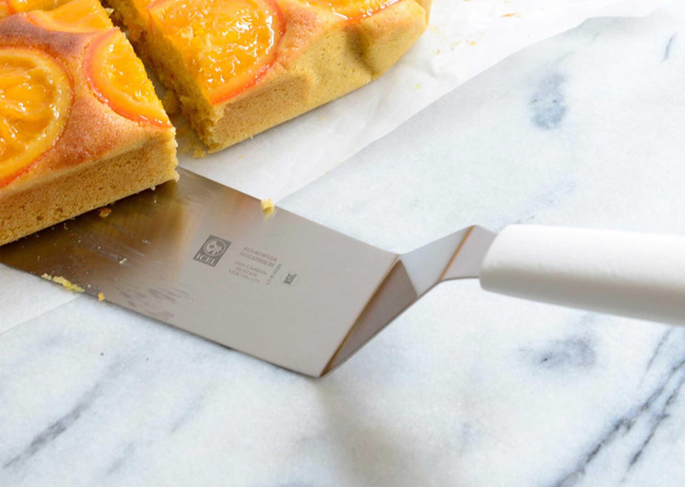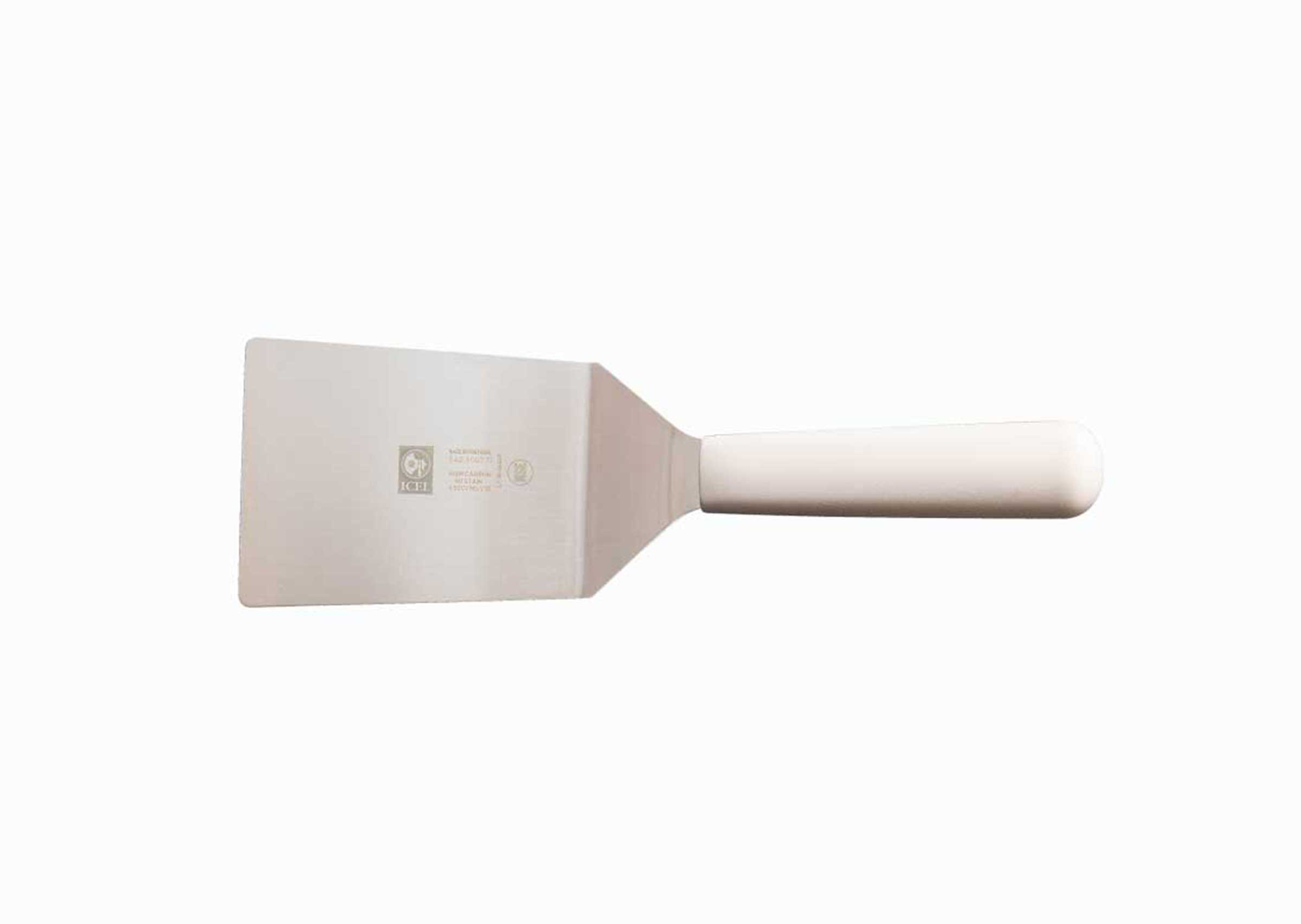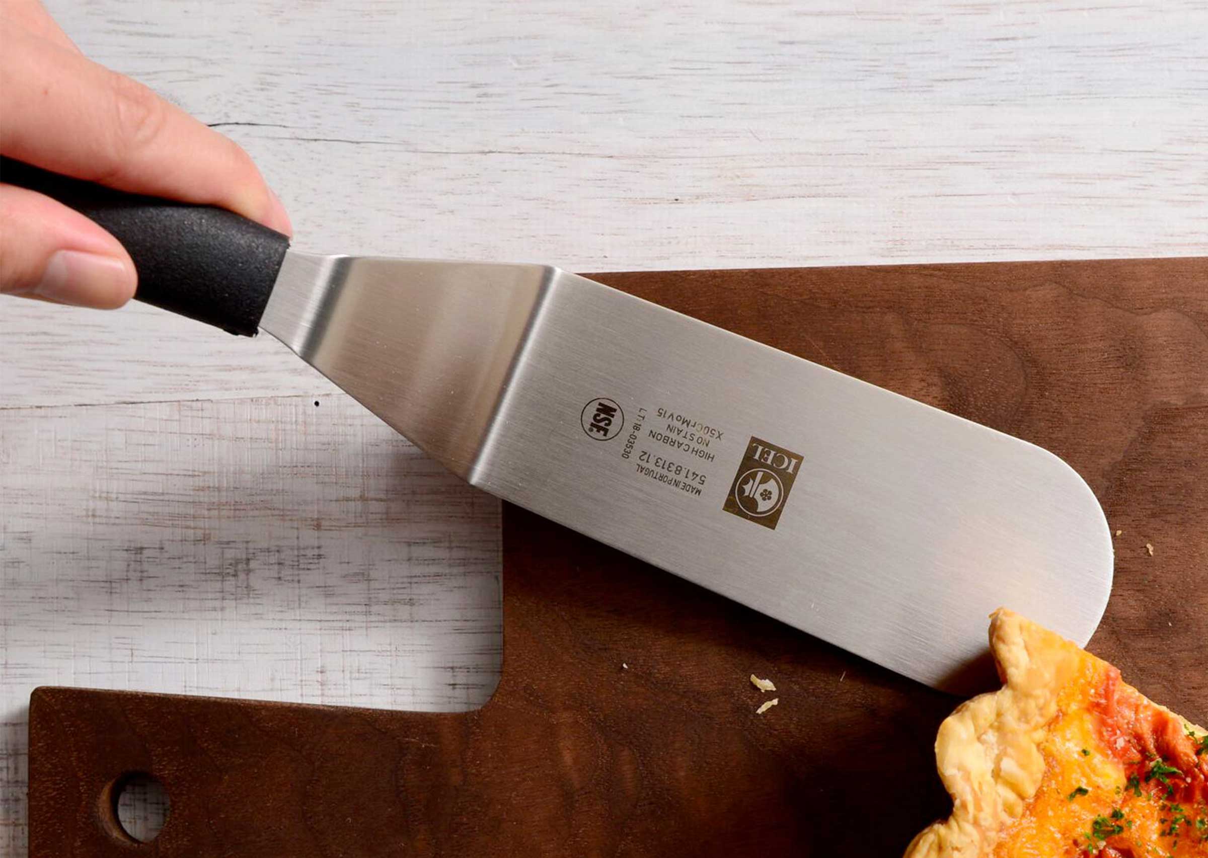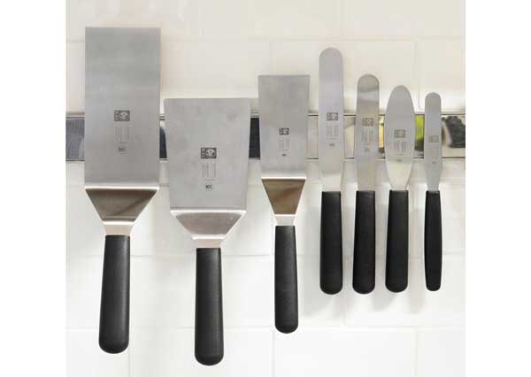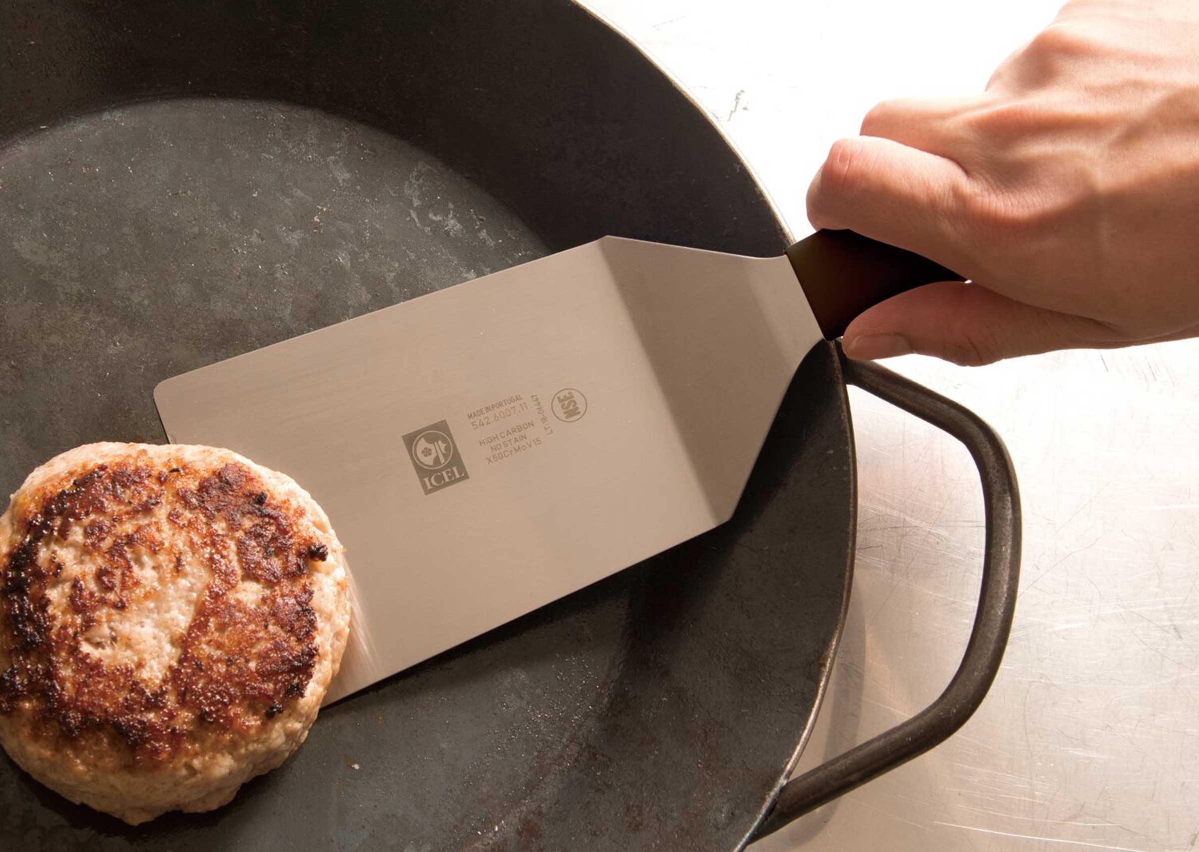 樹脂製のハンドルは握りやすく、ステンレス製のへらの先は薄く適度にしなやかでステーキの他目玉焼きやムニエルのお魚などデリケートな食材の下にも滑り込みます。特に先端の角が丸みのある形状のため、クレープやパンケーキ、卵などフワフワとした柔らかいものの扱いもしやすく安心です。