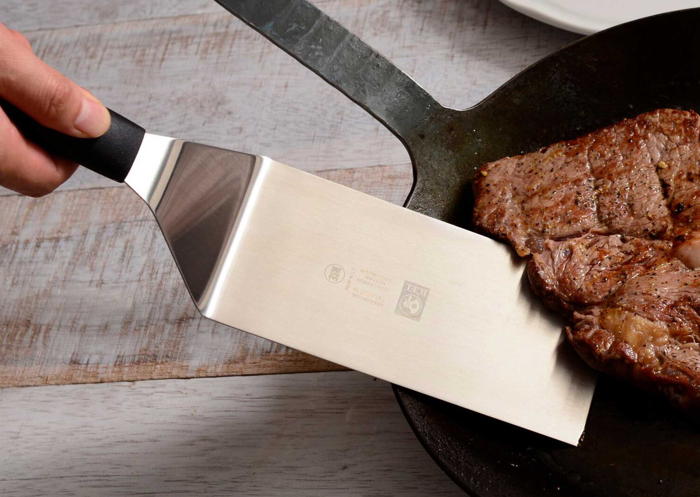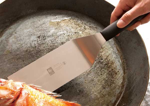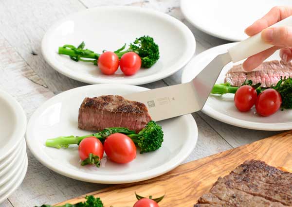 樹脂製のハンドルは握りやすく、ステンレス製のへらの先は薄く適度にしなやかで、ステーキの他目玉焼きやムニエルのお魚などデリケートな食材の下にも滑り込みます。