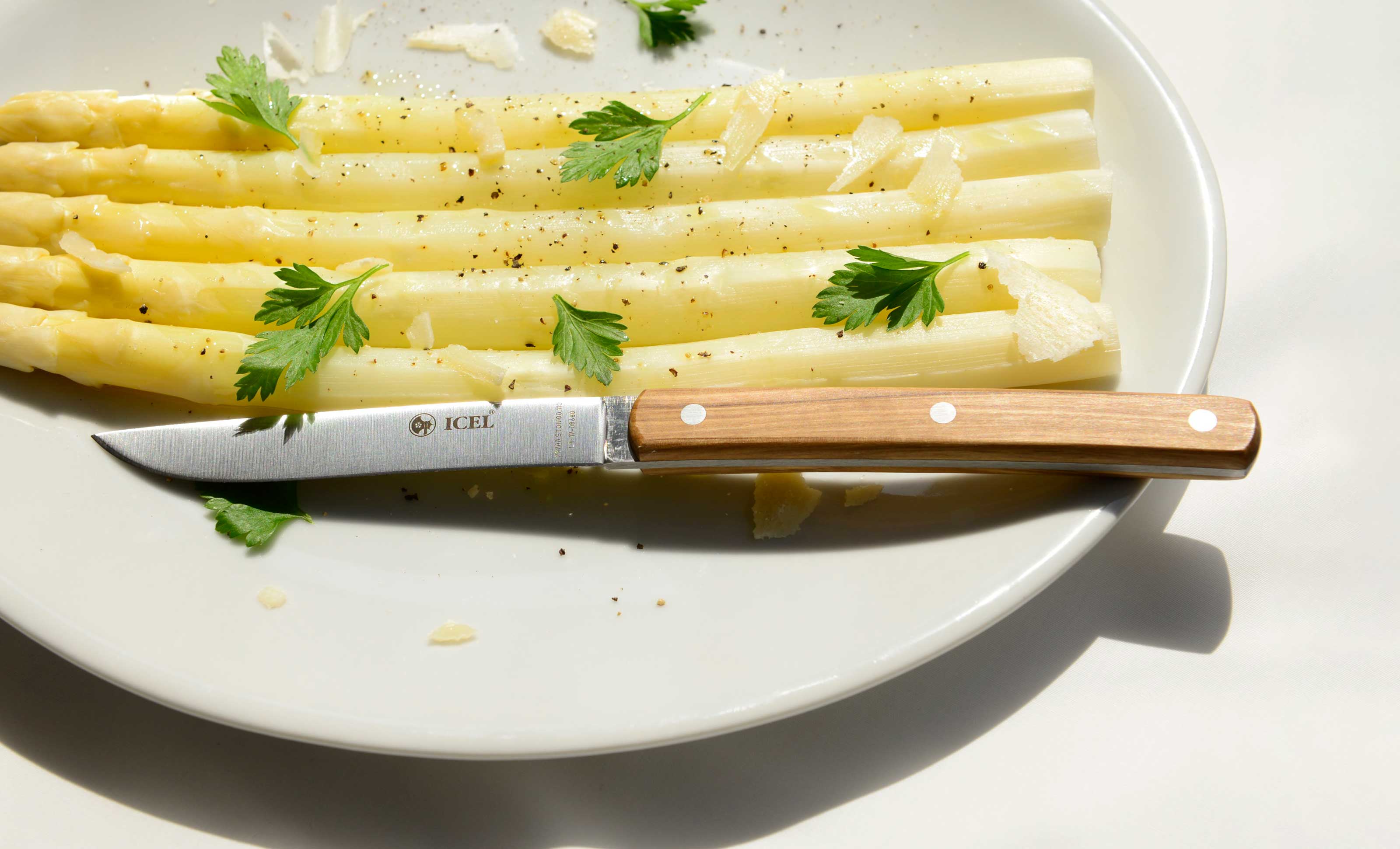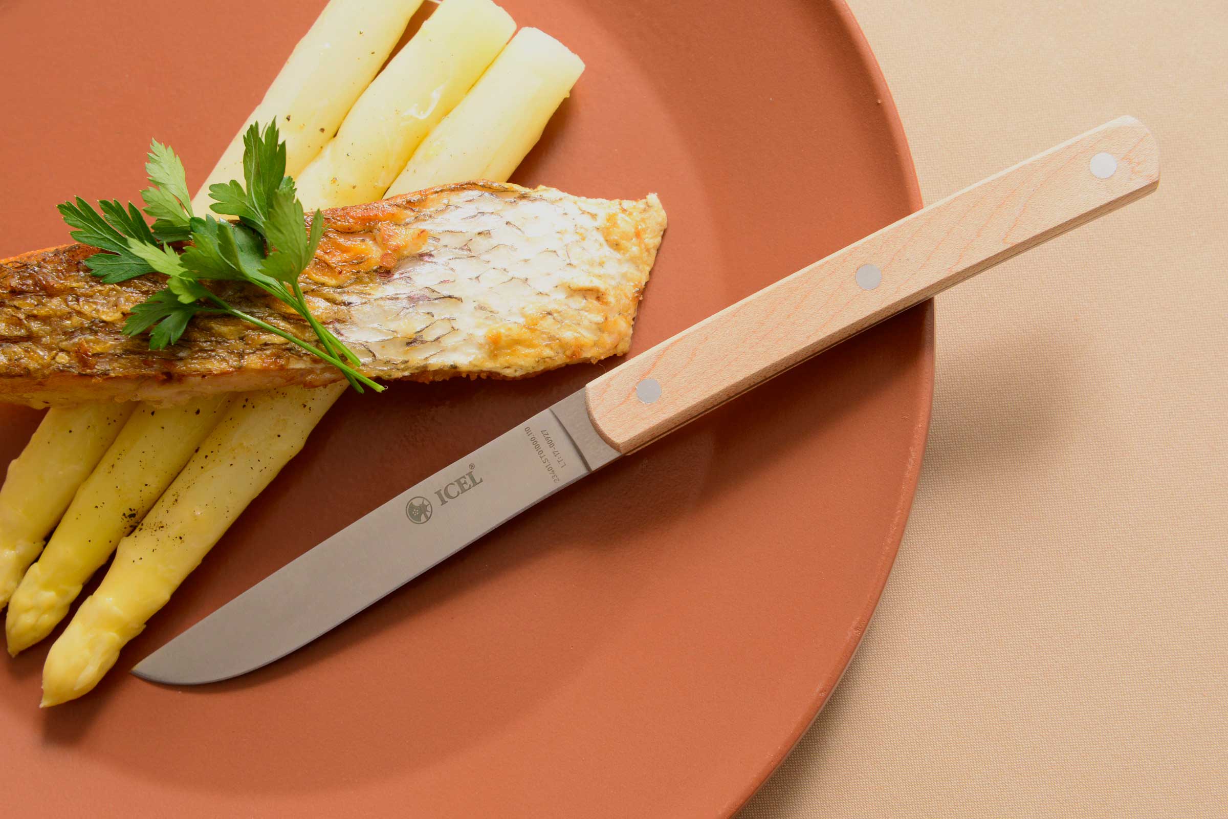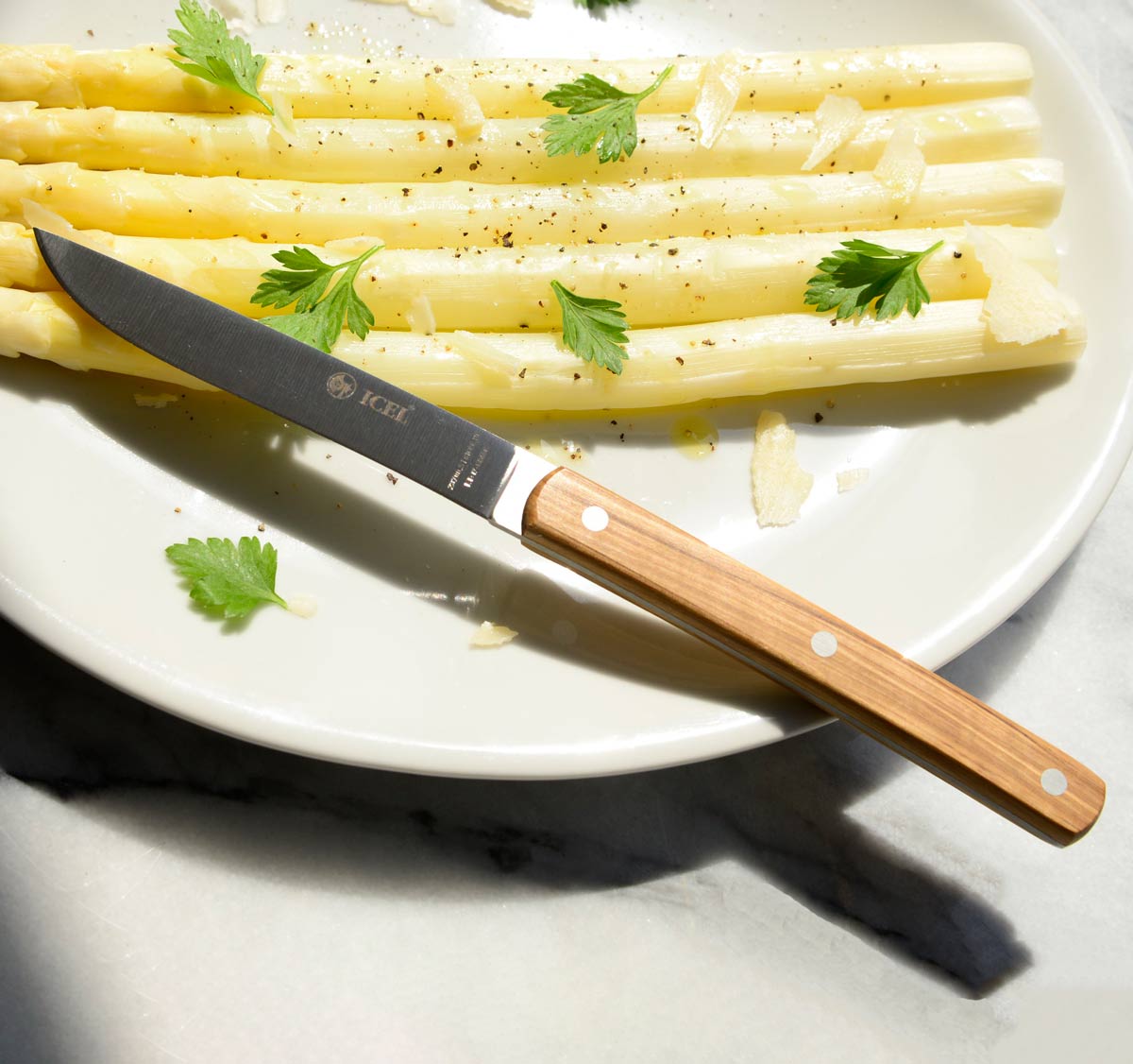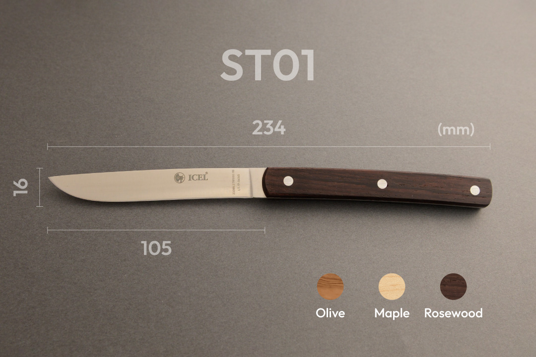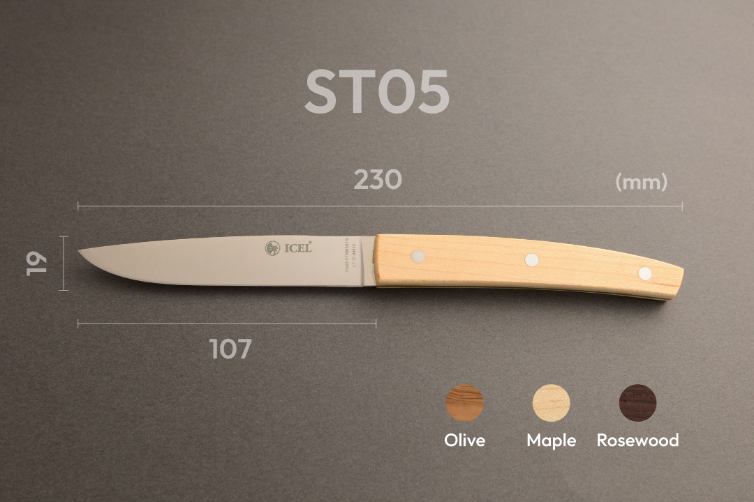 刃物メーカーが作る卓上のナイフは頑強な作りで抜群な切れ味です。それぞれハンドル部分は淡い色味が清潔感のあるメープル、密度が高く木目の美しいオリーブウッド、茶褐色の落ち着いた色味のローズウッドの3種のナチュラルウッドを使用。モダンでシャープなデザインはお持ちのフォークと組み合わせる他、カッティングボードに盛り付けたチーズやサラミなどの切り分けにもご使用いただけます。