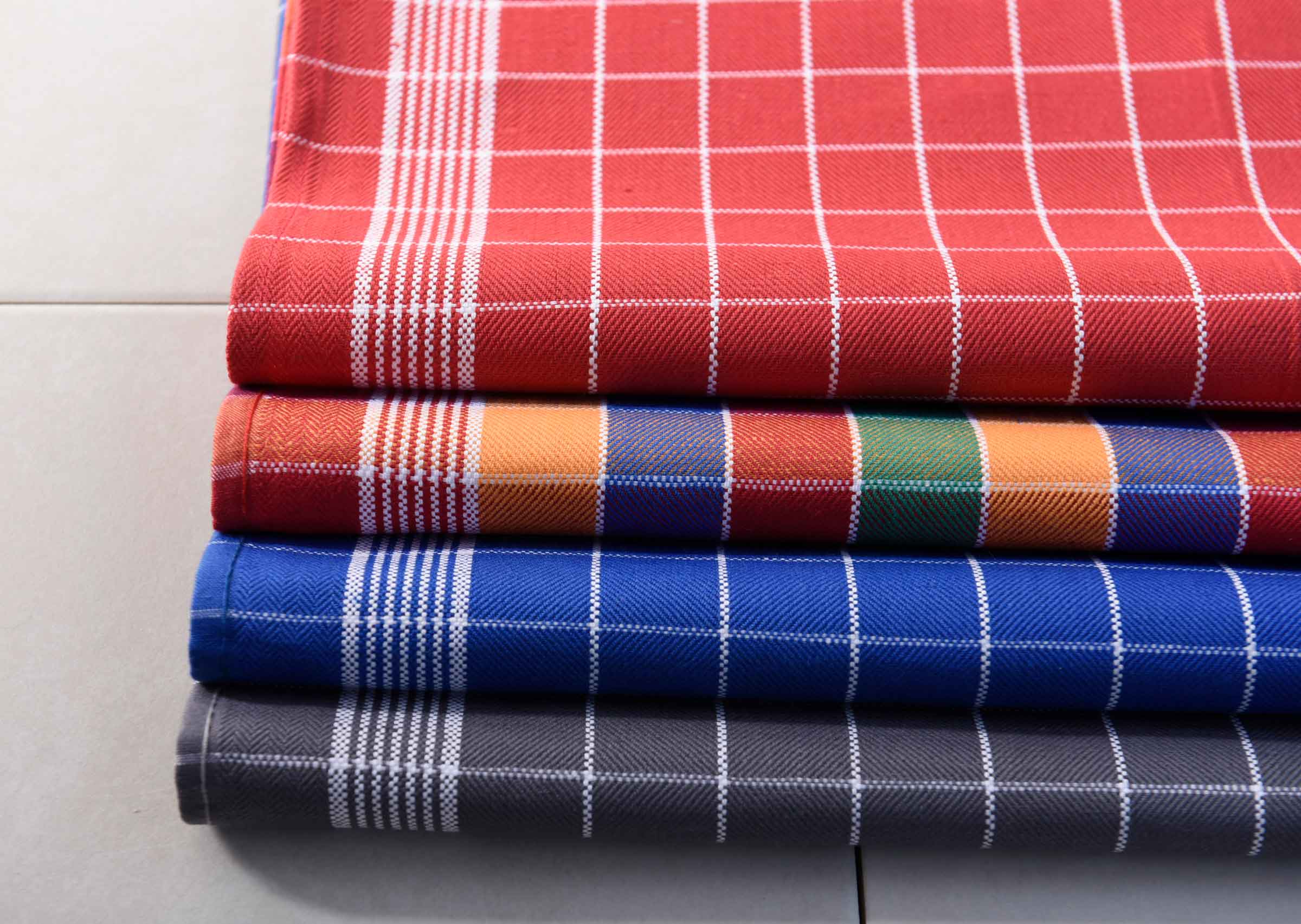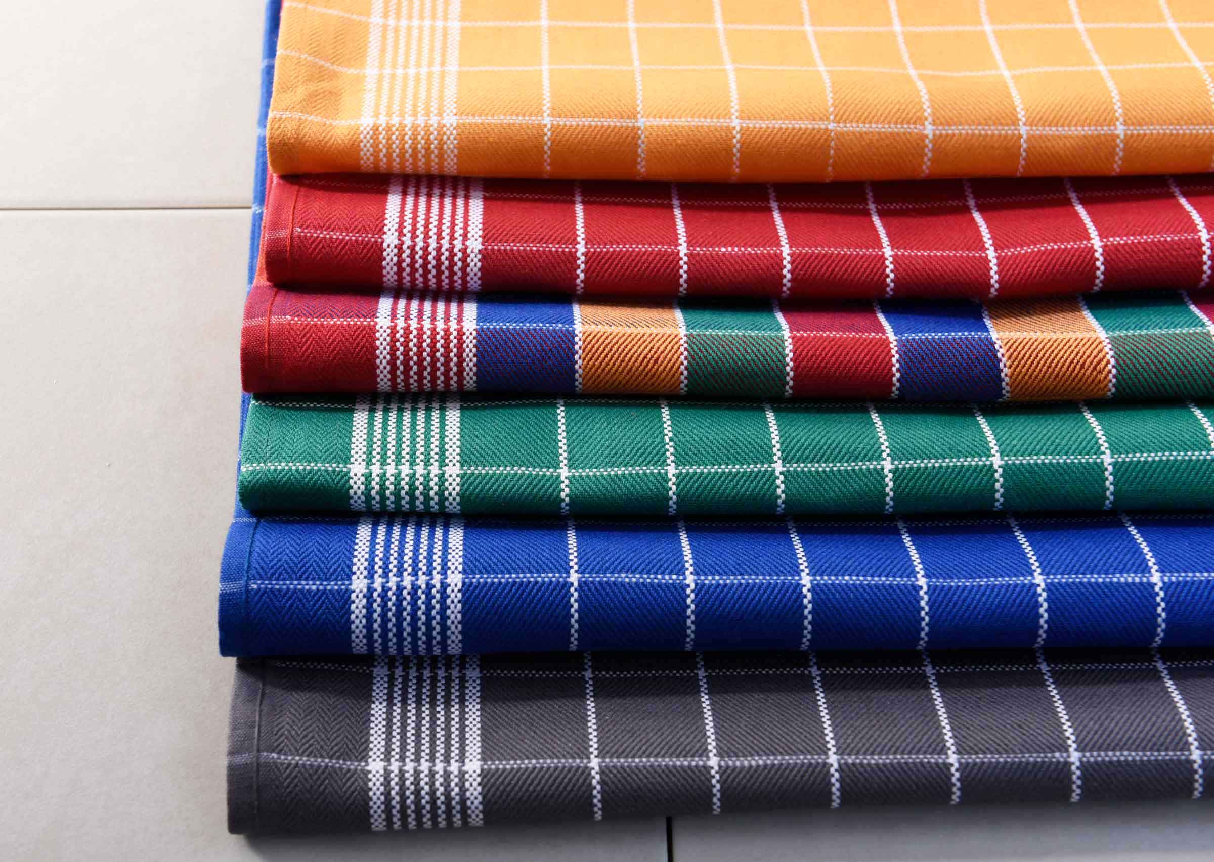 格子状のラインが入ったクラシカルなキッチンタオル。綾織りの目の詰まった布は厚みがあり、吸収力があるため、洗い替えを何枚も用意することなく食器拭きが捗ります。食器拭き以外にカフェテーブルのクロスにも活用いただけます。