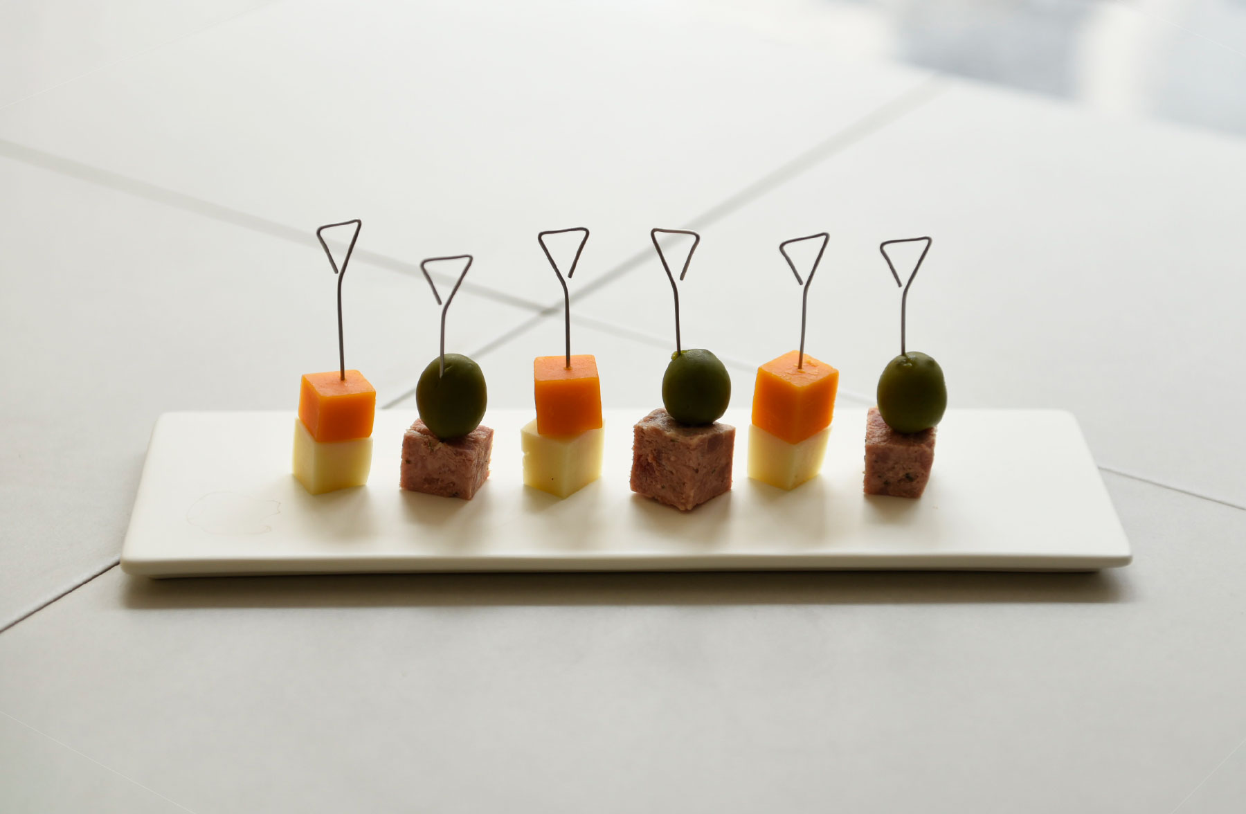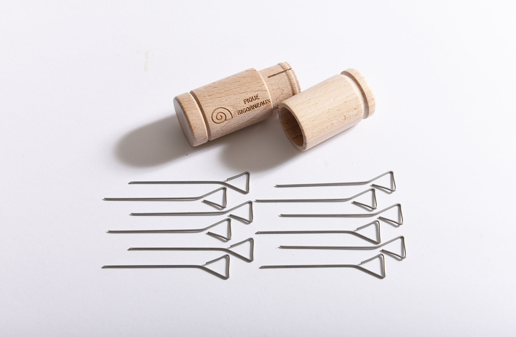 ミニマルなデザインのステンレス製ピックはピンチョスやフルーツなどに。保管しやすい木製のケース入り。