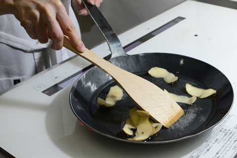 ここから加熱を始めます。 火加減は弱火。時折ゆっくりとターナーでかき混ぜます。