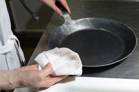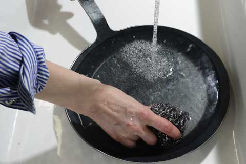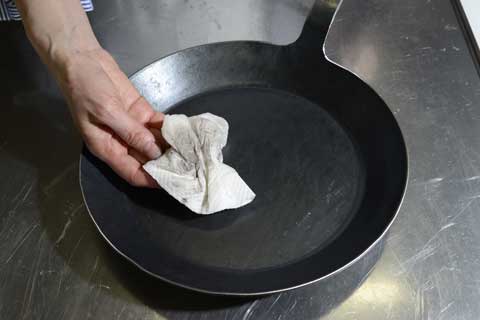 たわしでしっかりと汚れを落とし、お湯で洗い流した後は、火にかけて十分に水気を飛ばしてください。 鍛造を繰り返して製造しているため、初めの焼き慣らしで油が馴染みやすく、火にかけた後は、油を塗らなくても大丈夫です。(湿気を避け、なるべくキッチンに吊るしておくのがおすすめです。)