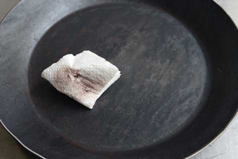 ペーパーをサラダ油に浸し油がまわっていない内側立ち上がり部分の鍋肌にたっぷりと馴染ませます。